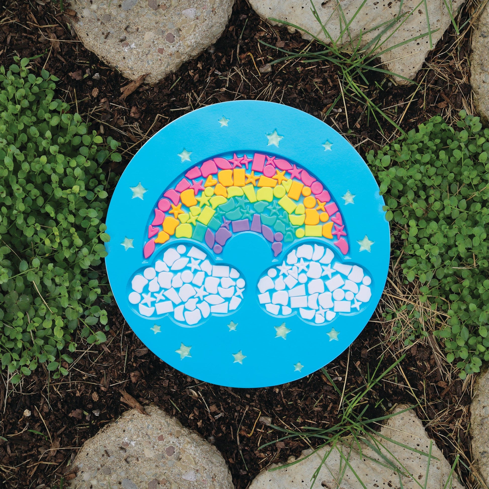 Easy pick & place mosaic tiles! Use stylus, weather resistant resin and eye-catching mosaic tiles to fill in a pre-molded cement stone and animate a rainbow design with unique patterns and colors