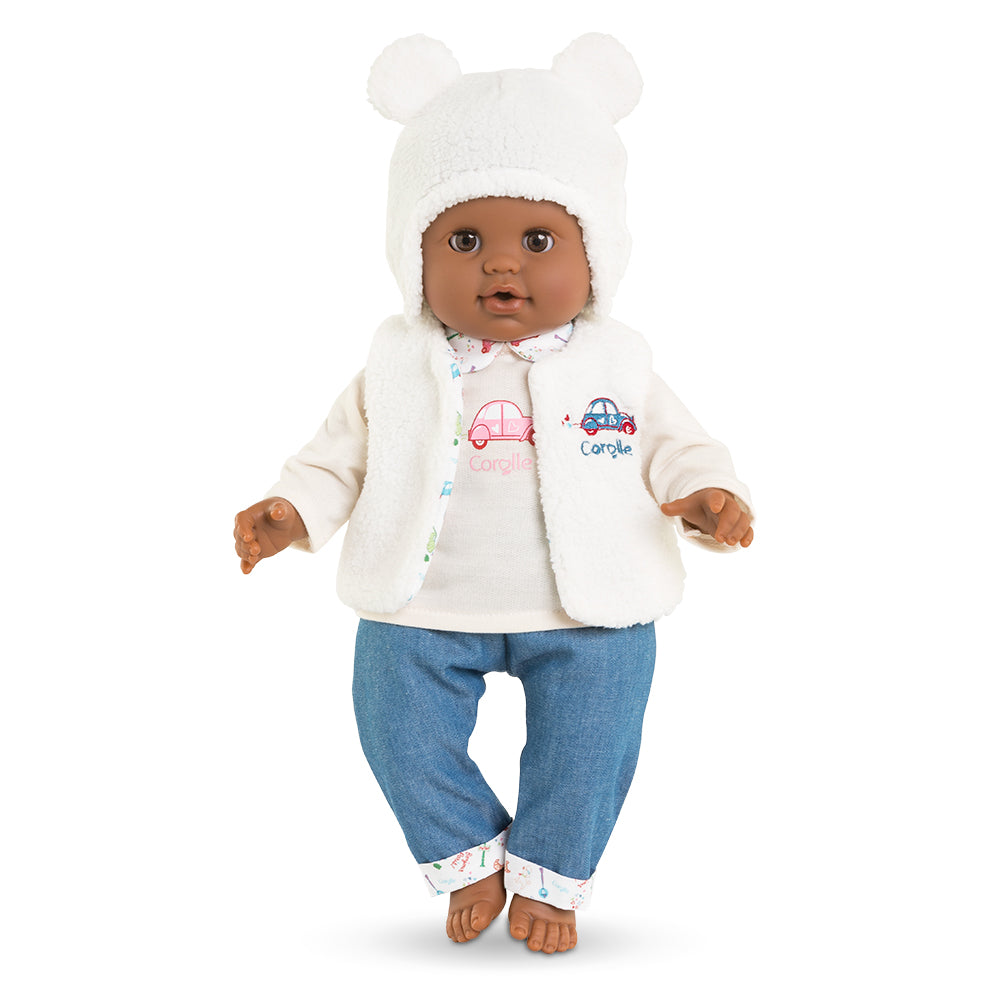 It includes a pretty, soft, reversible sleeveless cardigan and a fluffy beanie with teddy bear ears to keep your little one snug and warm. The lining of the cardigan features the exclusive fabric of the “Week-End in Paris” collection, a nod to our capital city. A little car is embroidered on the front of the vest.