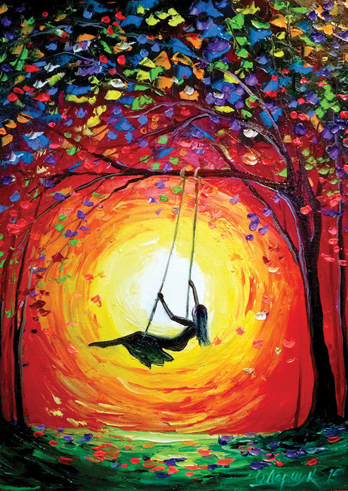 A young woman soars effortlessly through the air on a swing, suspended from a majestic tree bursting with rainbow-colored leaves. Bathed in the golden glow of the swirling sun, she becomes the heart of a peaceful, whimsical world where time slows and worries fade.