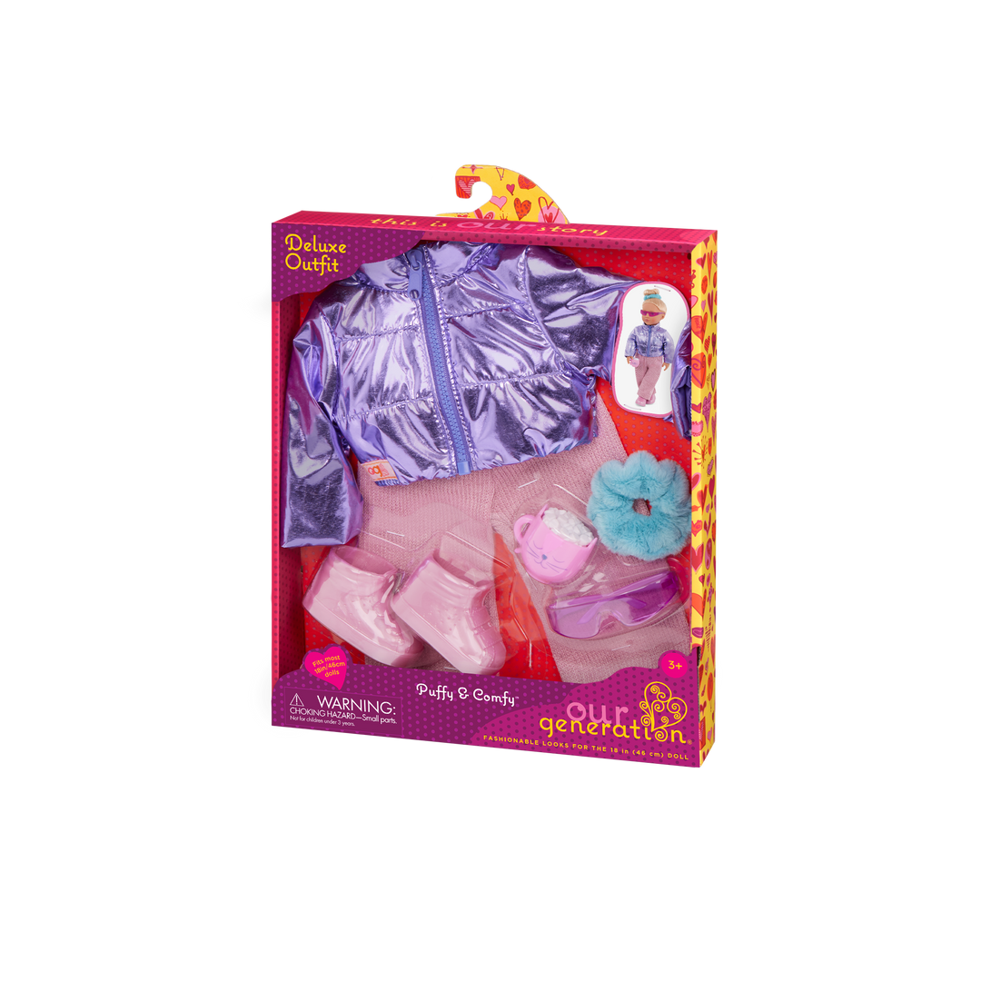 - 46 cm Doll Puffer Jacket: Bright styles and fashion fun shine with the Our Generation Puffy & Comfy outfit!