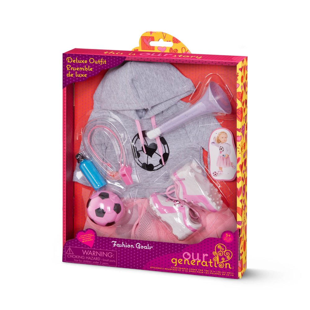 - This soccer outfit comes with a hooded sweatshirt, skirt, soccer ball, shoes and more!