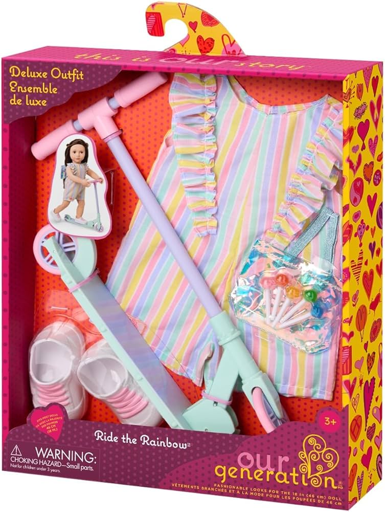 - 10-pc Doll Scooter Set: Scoot into fun with the Our Generation Ride the Rainbow outfit for 18-inch dolls!