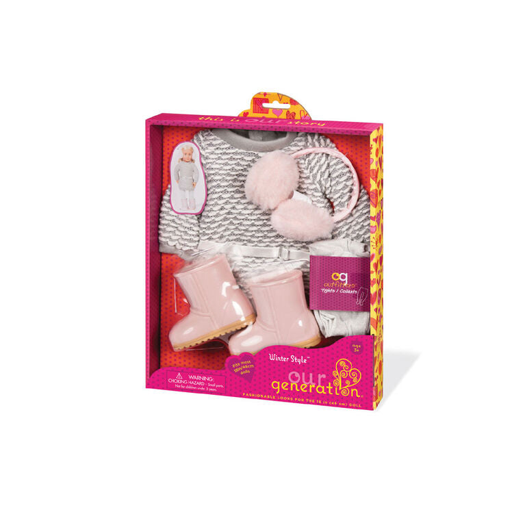 - 18-inch Doll Sweater Dress & Earmuffs Outfit: dress your dolls in fun, cozy fashion with the Our Generation Winter Style outfit!