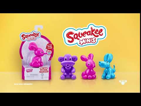 Squeakee Minis are the cutest mini balloon animals that love to play and interact with you! They look just like a party balloon animal, but they are full of sounds and reactions to make them come to life in the palm of your hand! They even repeat what you say in a squeaky helium voice when you press on their nose! You wont find a more entertaining, funnier pet than these Minis! Pat Minis and they'll give a squeak! Blow on their nose and theyll pretend to inflate then pop in a hilarious way! Get Heelie the Puppy, Billo the Monkey, or Poppy the Bunny!